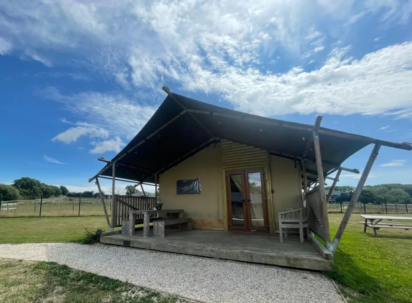 View our luxurious glamping tents which feature private shower rooms, kitchen areas, king and bunk beds, lockable PVC doors, electrical sockets and lighting.